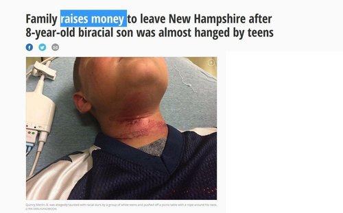 Family raises money to leave New Hampshire after 8-year-old biracial son was almost hanged by teens New York Daily News, September 16, 2017, 6:21 PMIt all sounds very familiar.He suffered an unspeakable trauma — one that could haunt him long after the rope burns around his neck begin to fade, his worried relatives say.