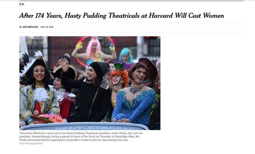 Women have long worked on those performances behind the scenes, but in keeping its cast resolutely all-male, the club seemed ever more like the stodgy relics it might have targeted. …Not getting the joke has become a career path.The university’s administration has also trained its focus on the school’s remaining single-gender organizations and exclusive social clubs, like fraternities, sororities and its rarefied Final Clubs, which were all-male social groups for much of their history. (The Hasty Pudding Theatricals is not exclusively male, because women work on the crews of its shows and play other roles in the organization. Still, the casts have always been all-male.) …