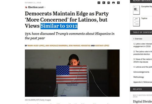 After more than a year of Republican presidential candidate Donald Trump making provocative comments about Mexican and Muslim immigrants and Hispanics in general, a new Pew Research Center survey of Hispanics finds their overall attitudes about the Republican and Democratic parties – and levels of political engagement – are not much different than they were four years ago.Wait, you mean the Trump campaign and the hysterical reaction to it haven’t made that big a difference in Hispanics’ political opinions?Democrats Maintain Edge as Party ‘More Concerned’ for Latinos, but Views Similar to 2012, By Mark Hugo Lopez, Ana Gonzalez-Barrera, Jens Manuel Krogstad and Gustavo Lopez, Pew Research Center Hispanic Trends, Oct. 11, 2016