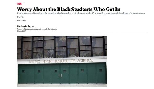 Author of the upcoming poetry book Running to Stand StillA few weeks back, when New York City announced the minuscule number of black students admitted to its elite specialized high schools, the report generated the usual dialogues around how the system is broken and what, if anything, can be done to fix it. There is no doubt that the numbers are abysmal: Only 12 black students scored high enough on the citywide test to win a seat at my alma mater, Bronx Science, and just seven to Stuyvesant. While I’m concerned for the black students continually locked out of these spaces, I’m equally concerned for those about to enter them. Remembering my academic career as a black kid in mostly nonblack settings, I’m exhausted for them. …