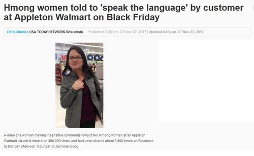 [Hmong women told to 'speak the language' by customer at Appleton Walmart on Black Friday, by Chris Mueller, USA Today Network-Wisconsin, November 27, 2017]