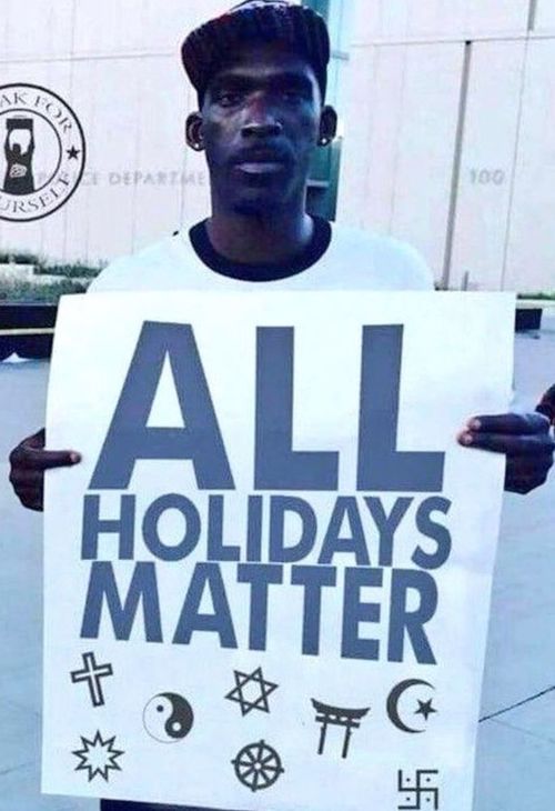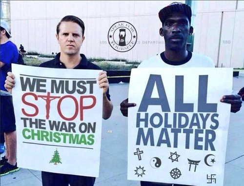 The "All Holidays Matter" guy has Christian, Jewish, Muslim, Buddhist, and Shinto symbols, plus one or two I don't recognize. I think the swastika is meant as representation of the Eastern religion from which the Nazis took it—but anti-Christmas trolls are not above declaring pro-Christmas activism to be implicitly Nazi.