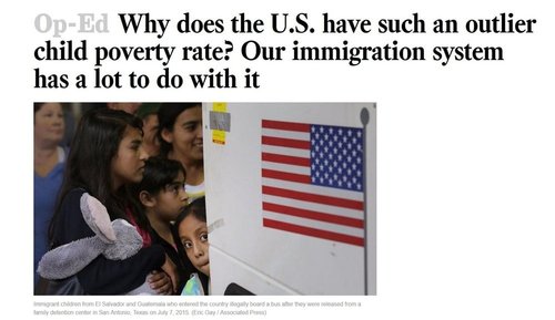 Op-Ed: Why does the U.S. have such an outlier child poverty rate? Our immigration system has a lot to do with it, By Kay S. Hymowitz, Los Angeles Times, October 29, 2017Articles about America’s high levels of child poverty are a media evergreen. Here’s a typical entry, courtesy of the New York Times’s Eduardo Porter: “The percentage of children who are poor is more than three times as high in the United States as it is in Norway or the Netherlands. America has a larger proportion of poor children than Russia.” That’s right: Russia.