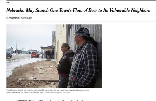 Nebraska May Stanch One Town’s Flow of Beer to Its Vulnerable NeighborsAs I’ve mentioned before, the Pine Ridge Sioux Indian reservation is just about the most tragic place in America. The Native Americans have imposed Prohibition on themselves, but Whiteclay, Nebraska is a town that mostly exists to sell beer to Indian alcoholics.By JULIE BOSMAN MARCH 25, 2017