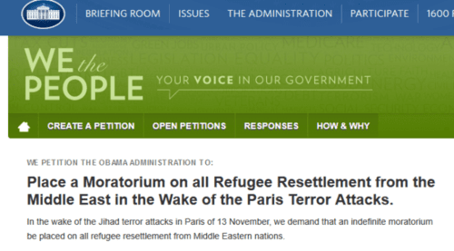 Five other, essentially simultaneous White House petitions opposing the "refugee" surge—here, here, here, here, and here—may have diluted support for the petition under discussion here. Those five attracted, in aggregate, almost 12,000 signatures. Still, all six petitions, combined, garnered fewer than 25,000 signatures, woefully below the 100,000 threshold for "action."