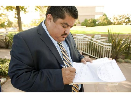 Jaime Segall-Gutierrez, an attorney representing both Victor Gonzalez and Jesus Reyna, signs his name on a claim for damages he will deliver to the city clerk's office at Anaheim City Hall during a press conference Friday morning. (Ken Steinhardt, The Orange County Register)