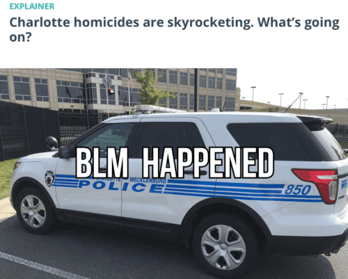 Black Lives Matter Protest In Charlotte Turns DeadlySubsequently, homicides in Charlotte have gone way up:09/21/2016 10:55 EDT