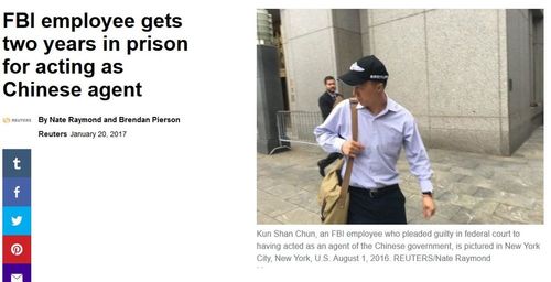 FBI Employee Gets Two Years In Prison For Acting As Chinese Agent, By Nate Raymond and Brendan Pierson, Reuters, January 20, 201]