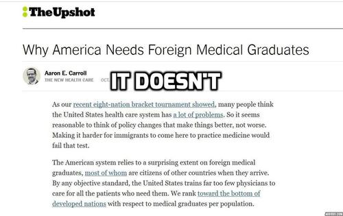 Clearly, doctor, like stoop farm laborer, is one of those jobs Americans just won’t do anymore. The shortage of American doctors couldn’t have anything to do with cartel behavior by powerful interest groups.