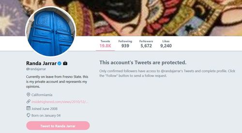 sweetie i work as a tenured professor. I make 100K a year doing that. i will never be fired. i will always have people wanting to hear what i have to say. even you are one of them! https://t.co/AMx9onyMD9According to the Fresno Bee, Jarrar shut down her Twitter account after it became clear that bashing Mrs. Bush wasn’t such a bright idea.— Randa Jarrar (@randajarrar) April 18, 2018