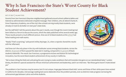 … Across the district, 19 percent of them [San Francisco public school black students] passed the state test in reading, compared to 31 percent of black students statewide. The result: San Francisco, a progressive enclave and beacon for technological innovation, has the worst black student achievement of any county in California. …