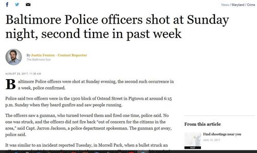 Baltimore Police officers shot at Sunday night, second time in past weekIn a tweet, Fenton extends his list of Baltimore police shootings through August backward:Justin Fenton, August 28, 2017