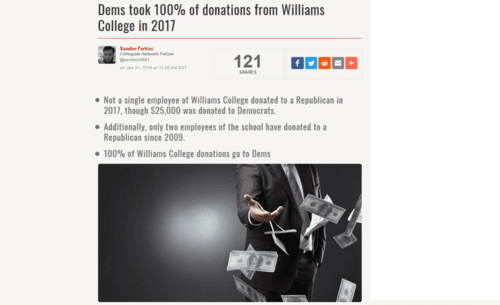 That's right: Employees of Williams College donated $25,000 to Democrat politicians in 2017, but not one red cent to Republicans. Since 2009, the total number of Williams College employees who have donated to Republicans is two.