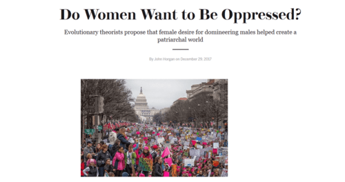 Do Women Want to Be Oppressed?Horgan wrote in Scientific American:Evolutionary theorists propose that female desire for domineering males helped create a patriarchal world