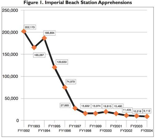 Congress passed a bill in 1996 to require construction of a double-layered fence (triple-layer in some places) in the San Diego corridor along the coast. You can see a picture of the fence with razor wire here. By the end of the decade, apprehensions fell by 95%He proceeds to discuss in detail how limited the work has been elsewhere
