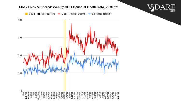 Third, the Floyd Effect didn’t begin on January 1, 2020, like I assume, but on May 25, 2020. Motor vehicle accident deaths weren’t up much in 2020 compared to previous years before Floyd Day. But black homicide deaths, after falling quite a bit in 2018 with the end of the Ferguson Effect under the Sessions Justice Department, began to creep upward again partway through 2019 and were rising in early 2020 before COVID and also during early COVID, before exploding in the last week of May during the first of the Mostly Peaceful Protests.