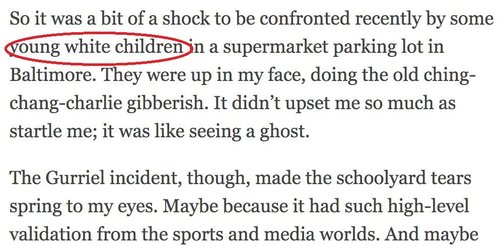 So it was a bit of a shock to be confronted recently by some young white children in a supermarket parking lot in Baltimore. They were up in my face, doing the old ching-chang-charlie gibberish. It didn’t upset me so much as startle me; it was like seeing a ghost.Yes, it's important to note when the people hurling racial abuse at Asians are white—since it happens so rarely. (Steve Sailer commented that "Baltimore, of course, is notorious for its roving gangs of racist white children.")