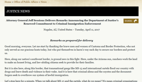 The transportation or harboring of aliens. As you know too well, this is a booming business down here. No more. We are going to shut down and jail those who have been profiting off this lawlessness — people smuggling gang members across the border, helping convicted criminals re-enter this country and preying on those who don’t know how dangerous the journey can be.This specifically refers to 8 USC 1324, as supported by the accompanying memorandum to all prosecuting attorney in the DOJ.[Attorney General Jeff Sessions Delivers Remarks Announcing the Department of Justice’s Renewed Commitment to Criminal Immigration Enforcement, Justice Department Press Release, April 11, 2017]