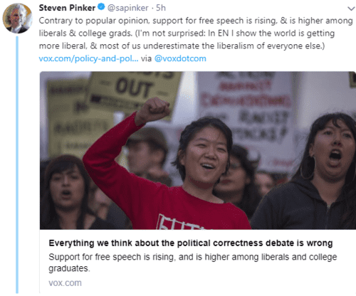 The right to openly talk about controversial or contentious subjects is a boomer ideal, one on track to die with them. It was born of a confident, victorious people during an era of nearly no immigration. The disunited polyglot of squabbling tribes now camped out from sea to shining sea have no use for it. Contrary to Pinker's opinion, its future is bleak.