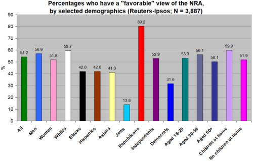 The following graph shows the percentages of respondents, by selected demographic characteristics, who have a "favorable view" of the NRA. The question is a dichotomous one, with the other option being an "unfavorable view" (N = 3,887):