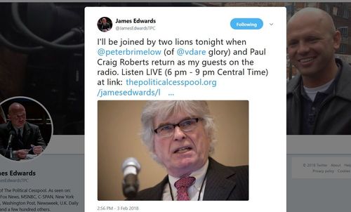 Peter Brimelow was on James Edward's The Political Cesspool Hour 2 yesterday.