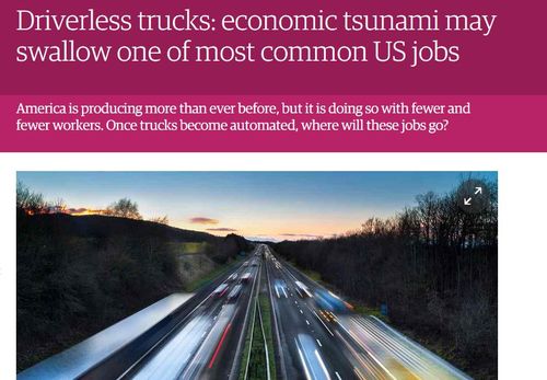 Driverless trucks: economic tsunami may swallow one of most common US jobs, By Martin Ford, The Guardian, February 16, 2017America is producing more than ever before, but it is doing so with fewer and fewer workers. Once trucks become automated, where will these jobs go?