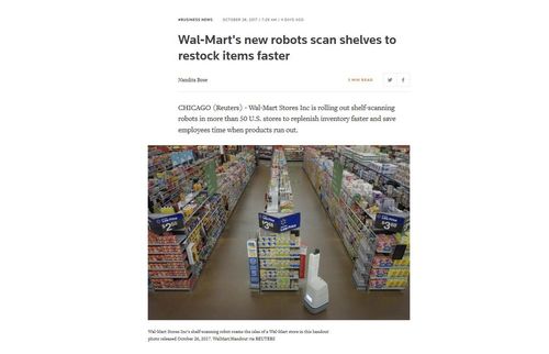 . . . “If you are running up and down the aisle and you want to decide if we are out of Cheerios or not, a human doesn’t do that job very well, and they don’t like it,” Jeremy King, chief technology officer for Walmart U.S. and e-commerce, told Reuters.