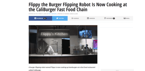 Flippy the Burger Flipping Robot is Now Cooking at the Caliburger Fast Food Chain, KTLA, March 5, 2018A robot named Flippy is now in the kitchen at a fast food restaurant called Caliburger in Pasadena. We were there for a preview event where Flippy made us some lunch.