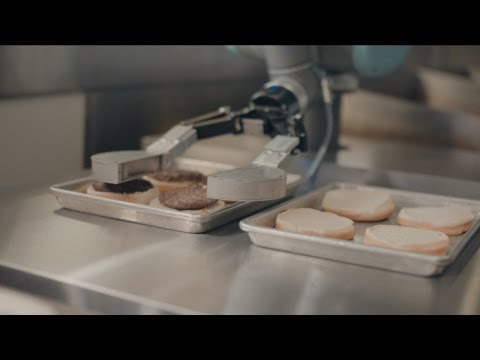 Machines that make the food require more advanced moving parts, but those are coming along also, such as the Flippy burger cooking robot, shown below: