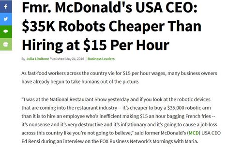 Meanwhile, the current CEO of McDonald’s Steve Easterbrook responded to Rensi with nonsensical remarks at a shareholder meeting (McDonald’s CEO says $15 hourly wage, robots won’t kill jobs, Reuters May 26):