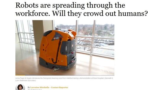 Robots are spreading through the workforce. Will they crowd out humans? Baltimore Sun, February 18, 2018The Swingobot 2000 was showing off, navigating a busy hallway at Sinai Hospital to scrub the floor. Then Tug, a smaller robot, glided up unexpectedly from behind, returning to the pharmacy after delivering medication to nurses.