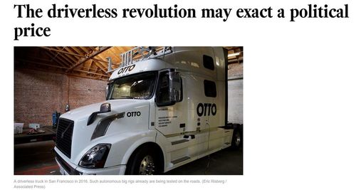 The driverless revolution may exact a political price, Los Angeles Times, November 22, 2017A driverless truck is seen at a garage in San Francisco in May 2016.