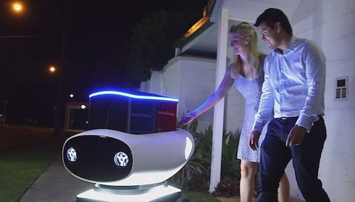 To summon DRU and its precious cargo of delicious pizza, a customer simply places an order as usual, then using a phone app, completes their transaction when the robot arrives at their door. DRU is even programmed to make small talk while the customer fiddles with the order app, presumably in an effort to increase the amount of its tip.
