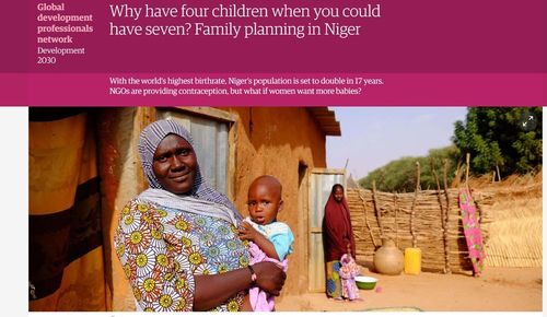 Why have four children when you could have seven? Family planning in NigerIt long seemed like the rest of the world could safely ignore Niger because it was a lightly populated backwater. But the UN’s 2017 forecasts figure its population will hit 64 million by 2050 and 192 million by 2100, which means that the world will be flooded with surplus Nigeriens if efforts aren’t increased.With the world’s highest birthrate, Niger’s population is set to double in 17 years. NGOs are providing contraception, but what if women want more babies?