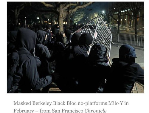 Berkeley Cancels Ann Coulter Speech Over Safety FearsThat’s an intentionally deceptive misstatement of the actual chain of events in Berkeley, reversing the who-whom order of events. It’s clearly referring to the violent no-platforming of Milo Y. in February by masked leftists against peaceful Milo fans, which then led to the brawl over the weekend in Berkeley that the right appears to have won. But perhaps 90% of the NYT’s readers will assume that “small, militant and shadowy right wing groups” started the current chain of violence in Berkeley. After all, they are mentioned first.By THOMAS FULLER APRIL 19, 2017