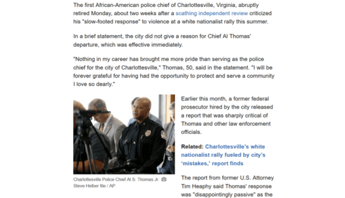 [Charlottesville Police Chief Al Thomas retires after criticism over rally, NBC News, December 19, 2017]