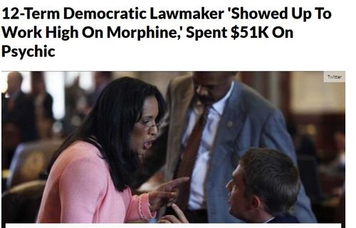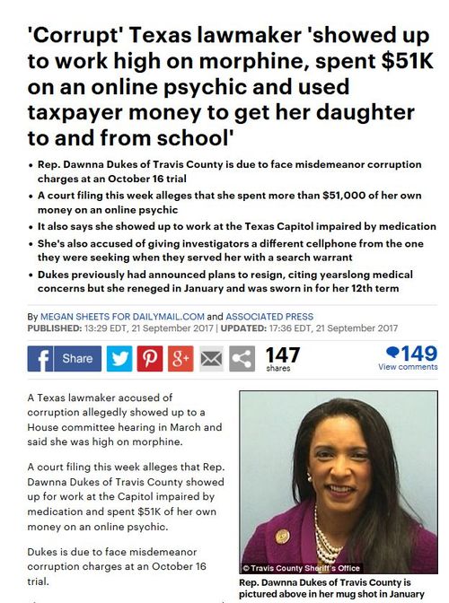 The Daily Mail's headline is, briefly, 'Corrupt' Texas lawmaker 'showed up to work high on morphine, spent $51K on an online psychic and used taxpayer money to get her daughter to and from school'.