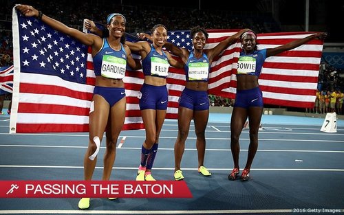 Allyson Felix, winning her fifth gold medal in her fourth Olympics, has the traditional middle-class African-American background: her father is a minister, her mother is a schoolteacher. Felix has what John Updike in The Coup called classic Negroid features, yet she’s the fairest of the four. Anchorwoman Tori Bowie from Mississippi is exceptionally dark for an African-American. She is darker than the Nigerian relay women.