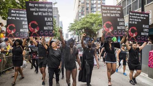 The picture above is from the BLM contingent in June’s Toronto gay pride parade. I’m particularly struck by the two posters reading: