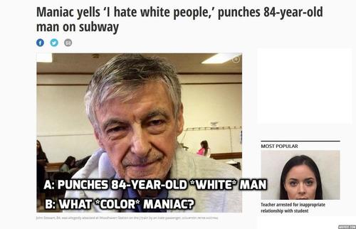 Maniac yells ‘I hate white people,’ punches 84-year-old man on subwayStewart, who obviously loves Big Brother, waited five days to report the attack. This is not good thinking—you can forgive people for what they do to you, but letting guys like that wander around is dangerous to society. His next elderly victim may actually die from being punched.by Laura Dimon and Graham Rayman, New York Daily News, August 29, 2017