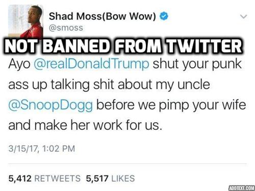 Ayo @realDonaldTrump shut your punk ass up talking shit about my uncle @SnoopDogg before we pimp your wife and make her work for us.Forgive the delay in reporting this. It's a few days old, but again, it does show just how much rappers have to offer our vast storehouse of American cultural treasures.— Shad Moss(Bow Wow) (@smoss) March 15, 2017