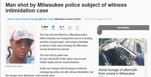 Man shot by Milwaukee police subject of witness intimidation case, Milwaukee Journal Sentinel, August 14, 2016Smith should have been in jail for his crimes, but because our judicial system is overwhelmed with black criminality, he slipped through the cracks (it should be noted that almost every homicide/nonfatal shooting in Milwaukee has a non-white suspect).The man shot and killed by a Milwaukee police officer Saturday was charged last year in a shooting and then charged again, with trying to intimidate a witness in that same shooting, the Milwaukee Journal Sentinel has learned.