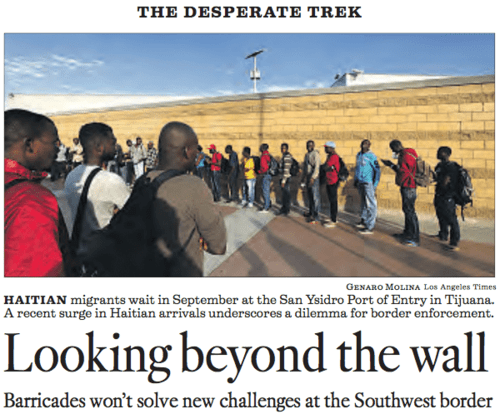 A changing border: Barricades won’t solve tough new challenges at the Southwest frontier, Los Angeles Times, December 31, 2016The surge of people from Africa, Asia and the Caribbean who have been trekking in ever-greater numbers across the Americas in hopes of reaching the United States presents the new U.S. administration with a conundrum.