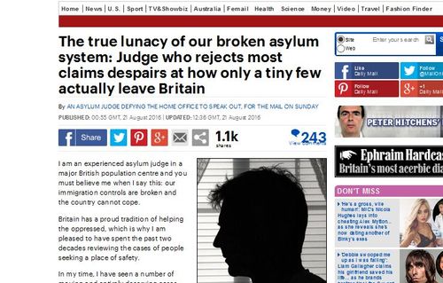 I am an experienced asylum judge in a major British population centre and you must believe me when I say this: our immigration controls are broken and the country cannot cope. [The true lunacy of our broken asylum system: Judge who rejects most claims despairs at how only a tiny few actually leave Britain; MailOnline, August 20th 2016.]The author is anonymous: "I am barred from speaking without the permission of the Home Office [=Justice Department, approximately], so today I must remain anonymous and so must the cases I have dealt with." According to the Mail, he received no payment for the article.