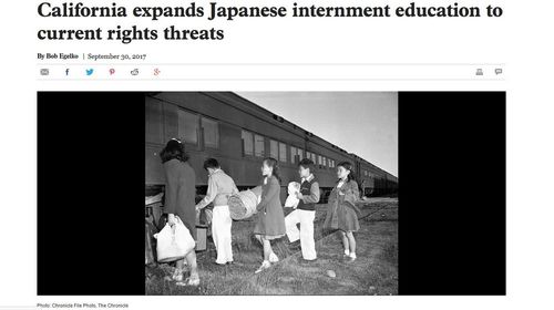 California expands Japanese internment education to current rights threats, San Francisco Chronicle, September 30, 2017The films, plays and public broadcasts California now funds to enlighten students and the public about the horrors of Japanese American internment camps in World War II will soon be expanded to illuminate more recent examples of persecution — including the Muslim immigrants targeted by President Trump.
