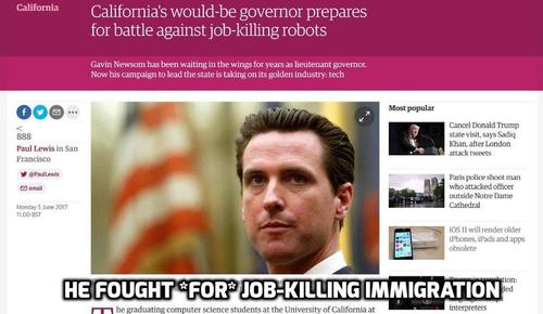 California’s would-be governor prepares for battle against job-killing robots, Guardian, June 5, 2017Gavin Newsom has been waiting in the wings for years as lieutenant governor. Now his campaign to lead the state is taking on its golden industry: tech