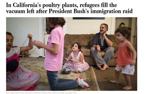 In California’s poultry plants, refugees from war fill labor vacuum, Los Angeles Times, July 31, 2017Taiseer Al Souki spends most days on his feet at a Foster Farms poultry plant, hefting table-sized plastic brown boxes and feeding them into a machine that cleans them.