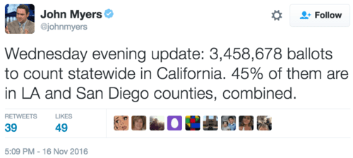 Back on November 16, I joked that California would finish counting its votes “by, at the latest, Thanksgiving. Or, worst case scenario, by Cyber Monday. Tops.”