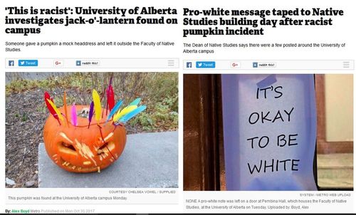 The day after someone left a racist jack-o-lantern outside Native Studies at the University of Alberta, a message reading ‘It’s okay to be white’ was taped to the building’s front door.
