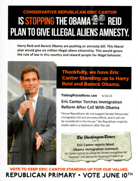 A week after lobbyist Haley Barbour praised Cantor for his commitment to passing an immigration amnesty–and claimed that Republican voters support it – Cantor dropped a mailer into GOP voters’ boxes claiming that he’s … a fighter against amnesty!illustrated with the above.